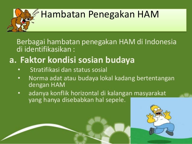 Faktor Perangkat Perundangan 5. O Hambatan hambatan dalam pelaksanaan HAM di Indonesia antara lain. Faktor kondisi sosian budaya Stratifikasi dan status sosial Norma adat atau budaya lokal kadang bertentangan dengan HAM adanya konflik horizontal di kalangan masyarakat yang hanya disebabkan hal sepele.