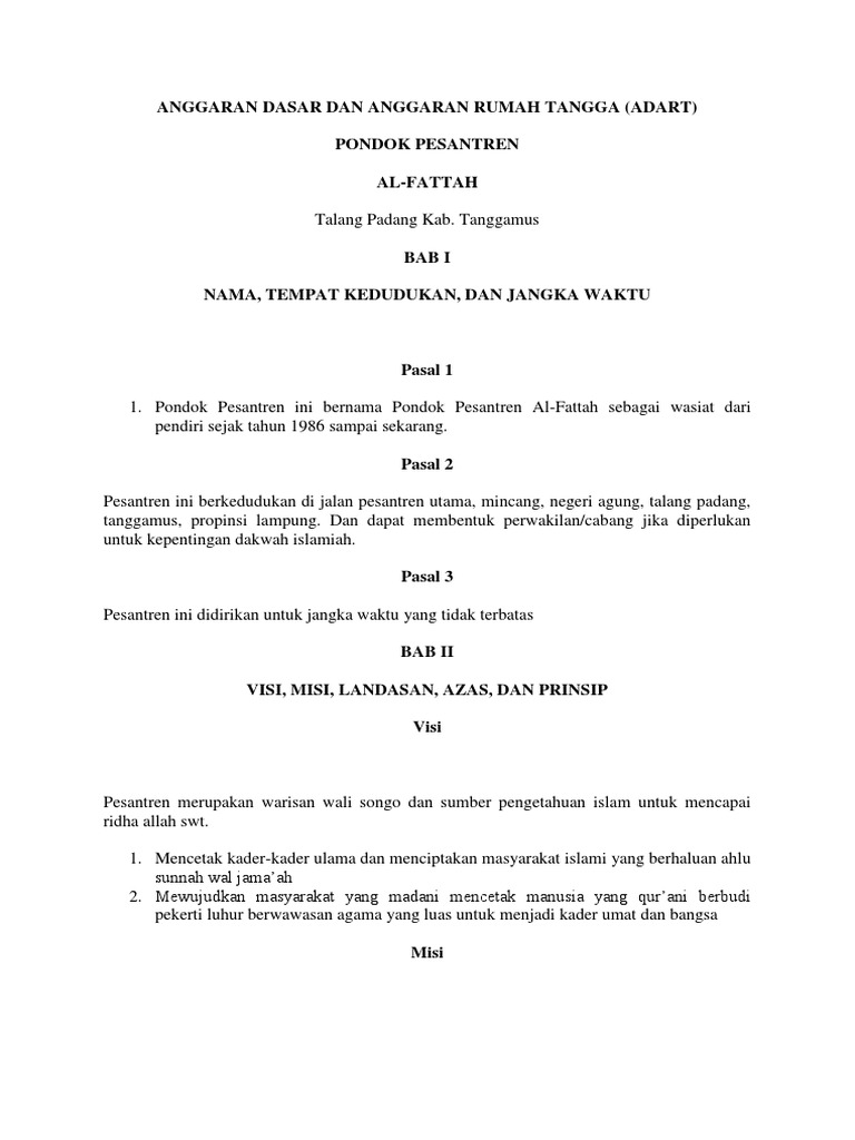 74 tanggal 29 mei 1980 desa pondowan kecamatan tayu kabupaten pati ا ا ا bab i pengangkatan pemberhentian dan penggantian organ yayasan bagian pertama pengangkatan dan penggantian pembina pasal. Dalam menjalankan tugas tentu saja tidak lepas dari aturan dasar yang mengatur yaitu Anggaran Dasar dan Anggaran Rumah Tangga ADART organisasi. Mengatur kebijakan-kebijakan dasar organisasi dalam berbagai fungsi yang diperankan oleh Yayasan.
