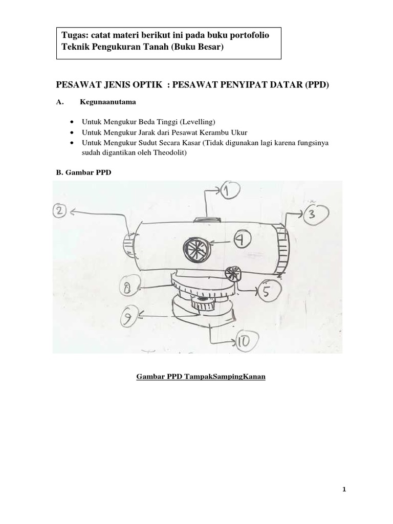 Video pengenalan Pesawat Penyipat Datar PPD yang bersifat umumDisini terdapat penjelasan singkat tentang pesawat penyipat datar tipe dumpy level tilting. Alat penyipat datar selama pengukuran mungkin saja bergerak ke samping ataupun ke bawah sehingga gelembung nivo pada alat penyipat datar tidak di tengah lagi dengan demikian garis bidik tidak mendatar lagi. Pesawat Penyipat Datar Waterpass Instrumen teropong untuk survey pengukuran sifat datar hanya menggunakan beberapa macam lensa dalam sebuah instrument.