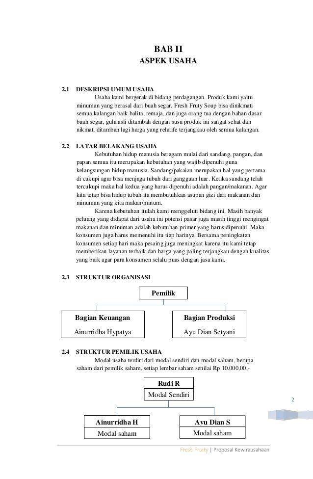 Jenis Produk Berisi tentang penjelasan produk Anda yakinkan bahwa produk Anda menarik dan memiliki kualitas yang bagus untuk menarik perhatian investor Proses Pembuatan Produk Jelaskan bagaimana produk Anda dihasilkan buat sejelas mungkin dan disarankan membuat diagram alir prose pembentukan produk. Contoh Proposal Usaha Kewirausahaan Bisnis Januari 23 2018. Nama produk adalah nama yang diberikan kepada suatu barang dagangan yang fungsinya untuk mengetahui nama panganan tersebut dan barang dapat di ingat lewat nama.