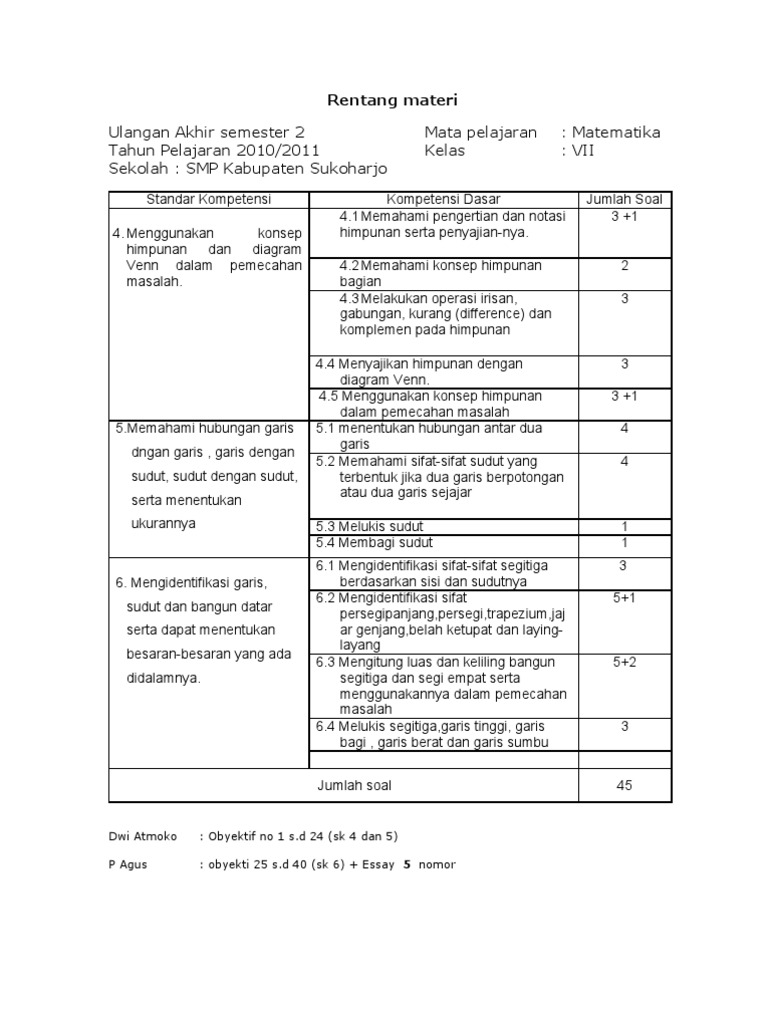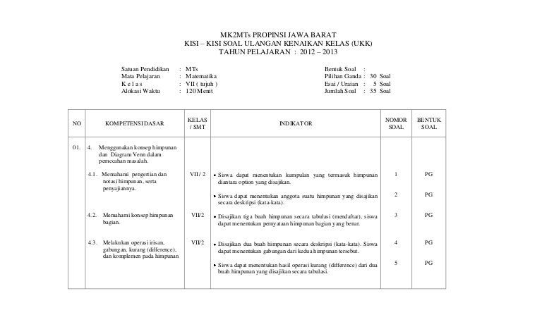 Semua Perangkat disini sudah kami susun sebaik mungkin untuk menghemat waktu luang anda. Silabus IPS K13 Kelas 7 Tingkat SMP Tahun 2020-2021 digunakan untuk menyebut suatu produk pengembangan kurikulum berupa penjabaran lebih lanjut dari standart kompetensi dan kemampuan dasar yang. Kelas 7 Kompetensi yang diujikan pada UKK kelas 7 TP 20152016 No Materi KD Kompetensi yang diuji No soal 1 Himpunan Menyatakan himpunan dengan cara mendaftar 1 Menyatakan himpunan dengan menyebut syarat keanggotaannya 2 Membedakan unsur yang merupakan anggota atau bukan anggota suatu himpunan 3 Menyatakan himpunan bagian 4 Menyatakan irisan dua himpunan.
