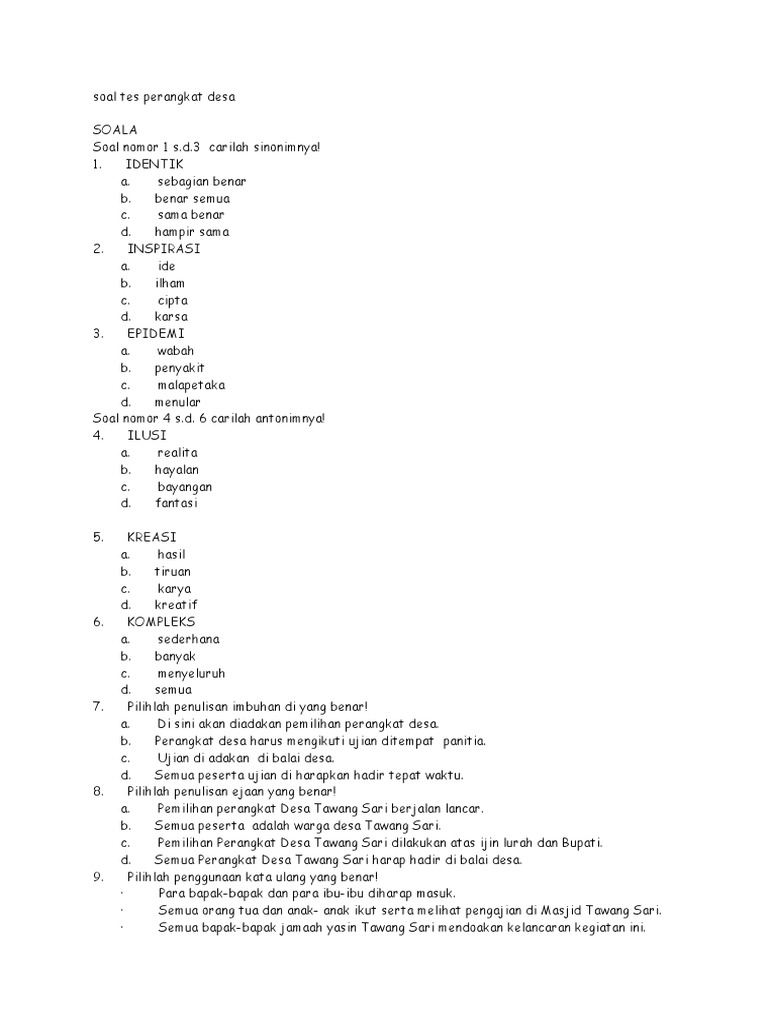 100 contoh soal ujian tulis perangkat desa 2020 dan kunci jawaban pdf download. Baiklah berikut ini adalah 100 Contoh Soal UJIAN TULIS Perangkat Desa 2021 dan Kunci Jawaban. Calon kepala bpd badan permusyawaratan desa minimal berpendidikan a.